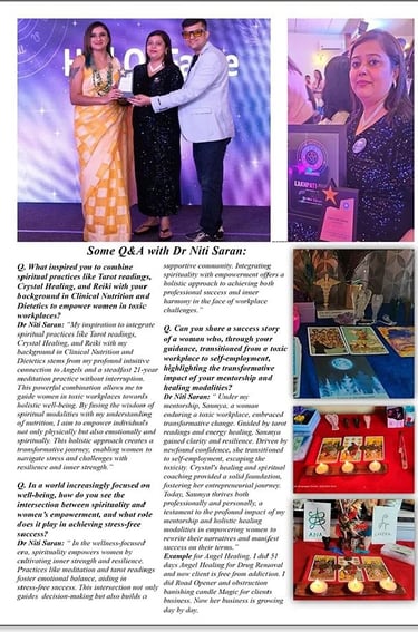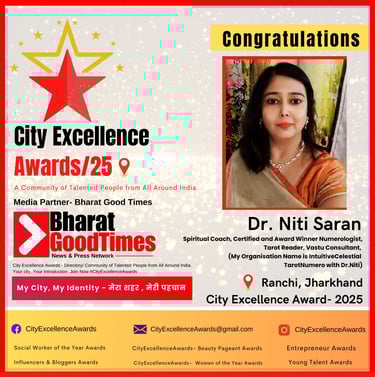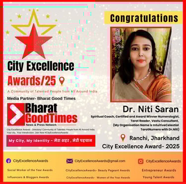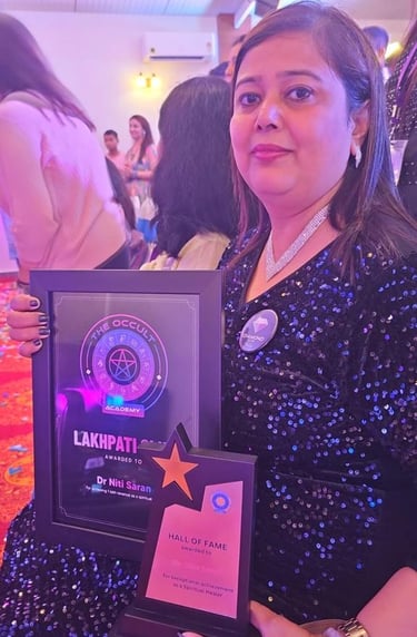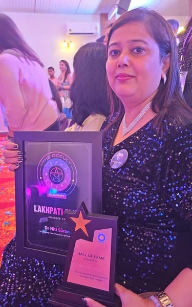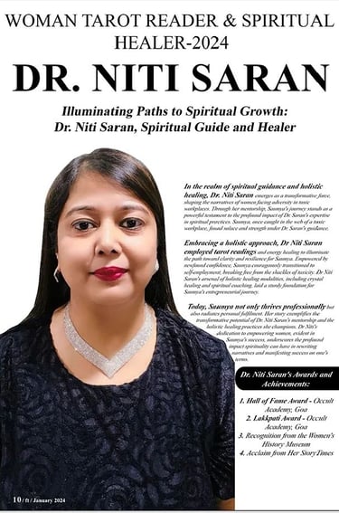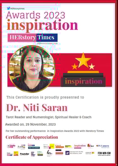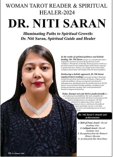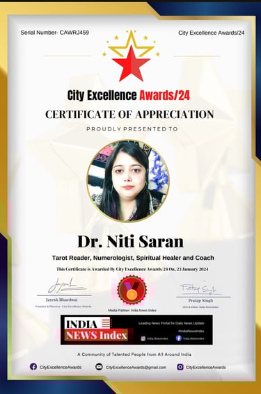 Dr. Niti Saran, a renowned tarot reader, numerologist, Vastu Consultant spiritual healer, and coach, is a prominent figure in the field of spirituality. With over 22 years of experience in the spiritual path, she has dedicated her life to meditation and is a devoted follower of Paramhansa Yogananda. Recognized for her exceptional skills, Dr. Saran has been honored with numerous awards as the best spiritual healer. Her mission is to empower women who work in stressful and toxic environments, offering them guidance and support. Driven by her deep devotion to the spiritual world, she strives to provide solutions to all your questions and concerns. With Dr. Niti Saran, you can trust that you will find the answers and clarity you seek. She is Blue Diamond Awardee for Best Spiritual Coach and Healer given by Legend Iconic Hema Malini in 2025. She also co-author of the book "Fearless Feminine" launched by Hema Malini. This book is based on true life stories of transformed and successful women in Inida.